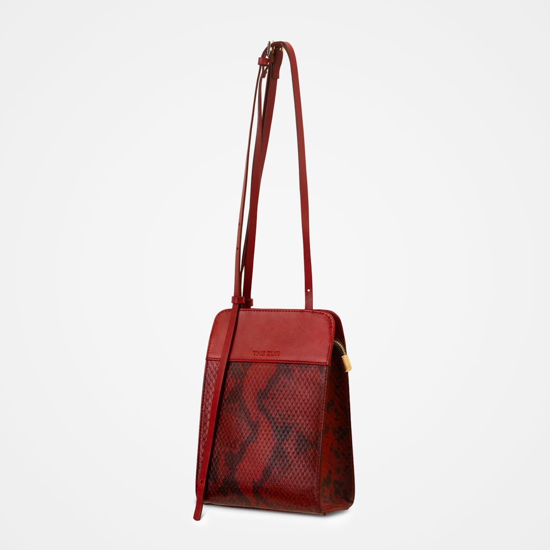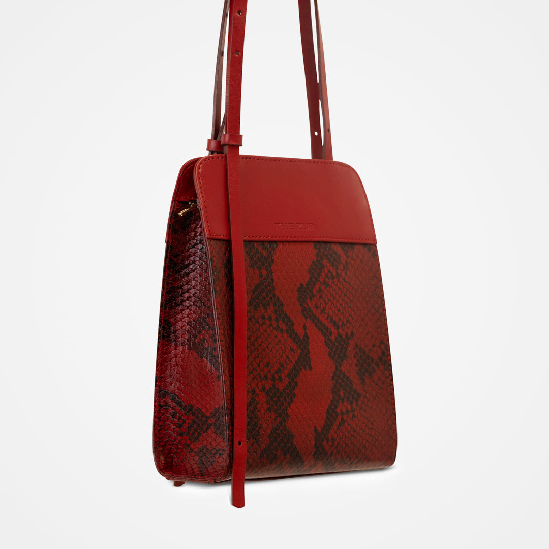 The North Bag Clara is defined by its bold red python-embossed leather, elevated with smooth leather details. Its versatile silhouette allows it to be styled crossbody, over the shoulder, or carried by hand. Inside, it features a card pocket stamped with the THE ZUR logo in gold foil and a compartment that fits a 13 cm phone.