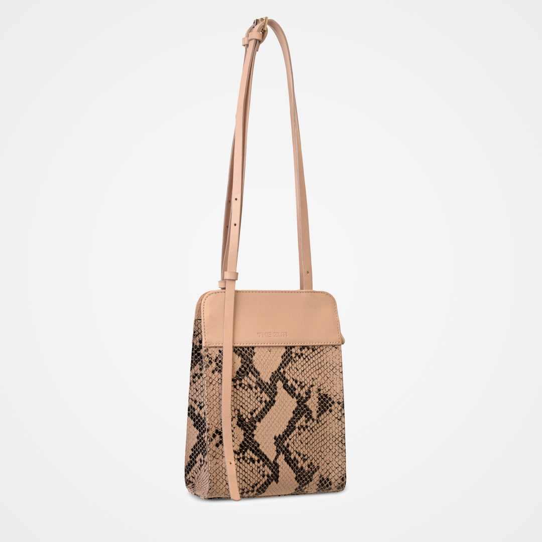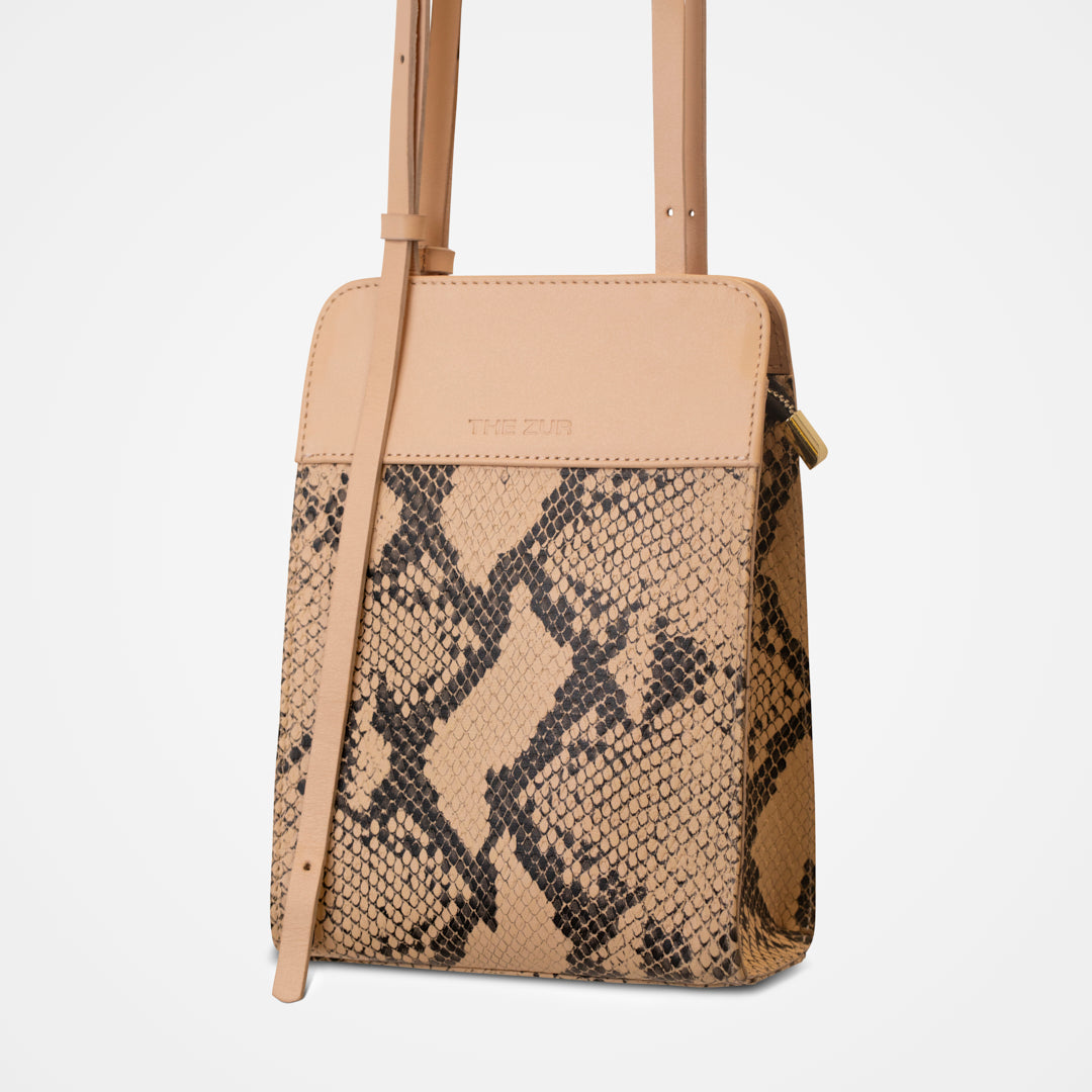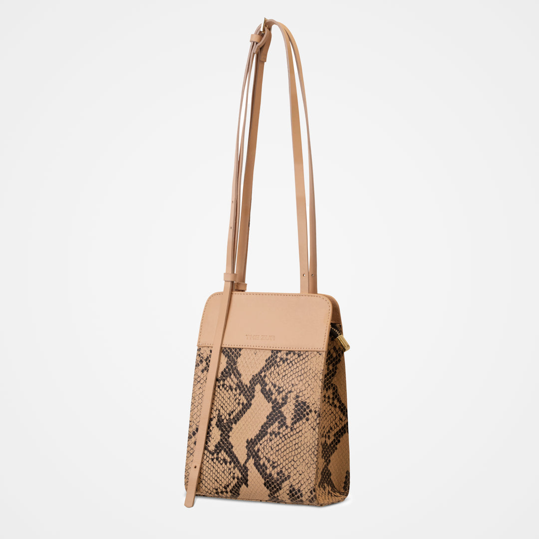 The North Bag Ray stands out for its neutral, sophisticated tone in nude python-embossed calf leather, with smooth leather trim. Its structured shape makes it adaptable — worn crossbody, on the shoulder, or carried by hand. The interior includes a card pocket with the gold-foil THE ZUR logo and a dedicated compartment for a 13 cm phone.